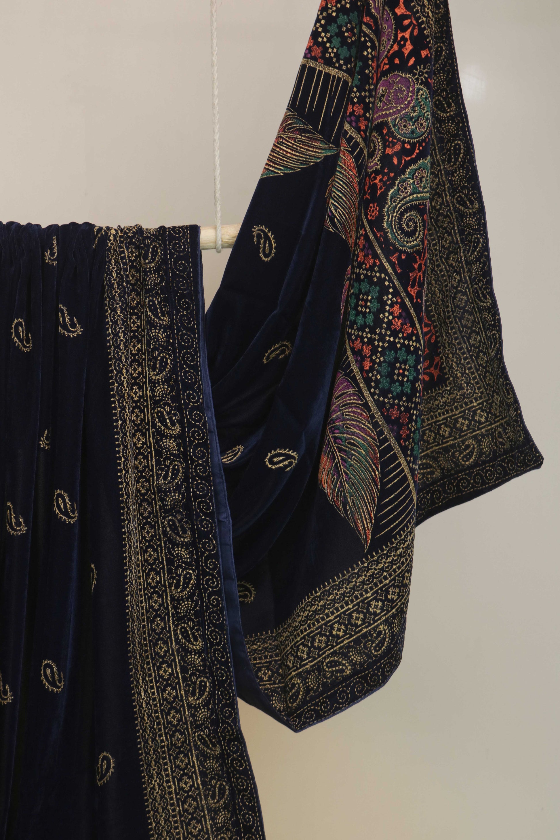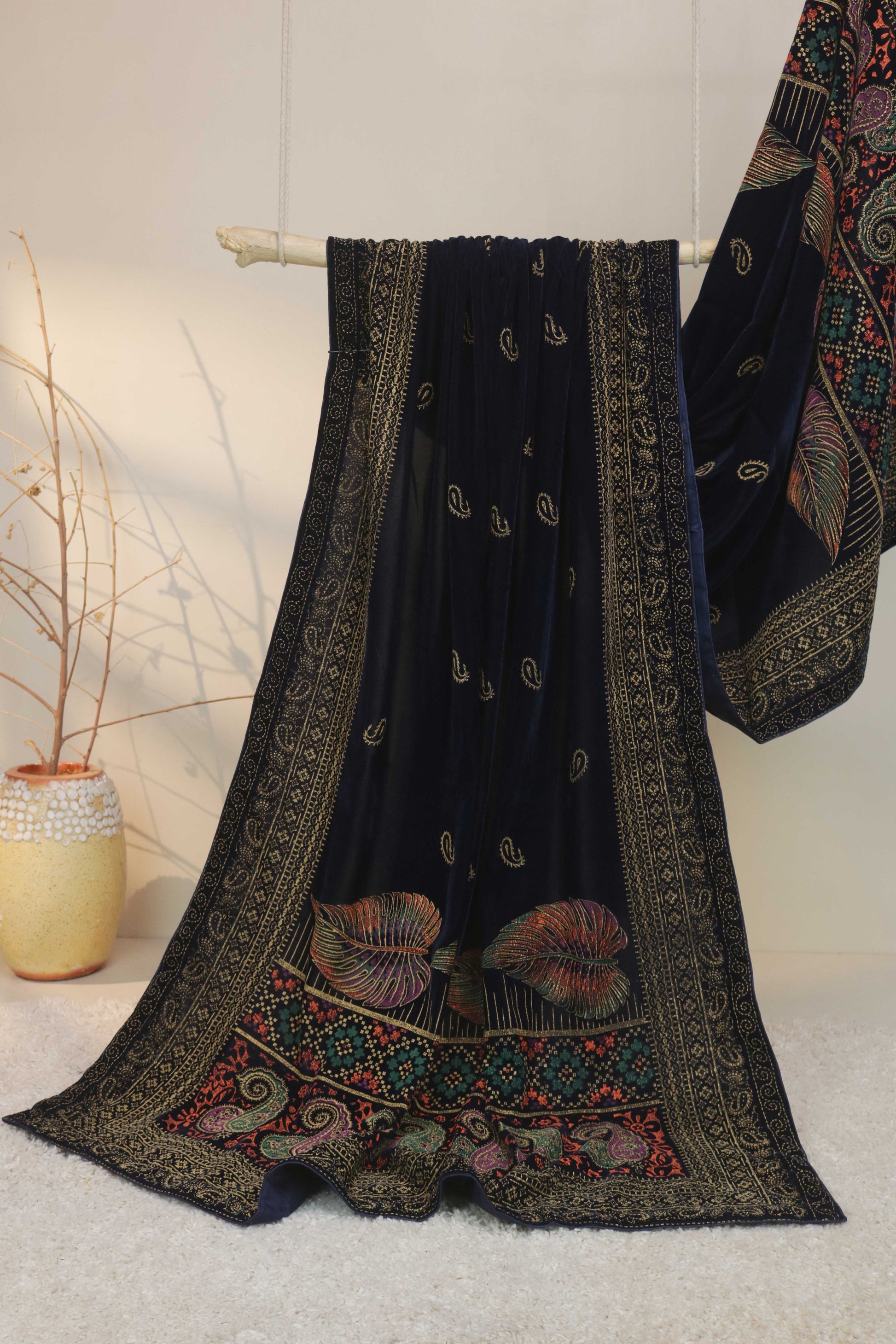 This velvet screen-printed shawl beautifully combines luxury and tradition.