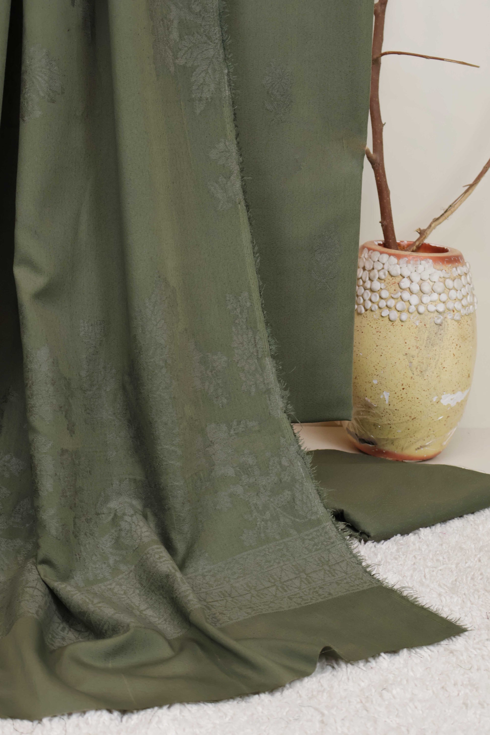 Description: Fabric: KarandiShirt: Karandi Velvet Embose Shirt 3 MeterShawl: Velvet Embose Shawl 2.5 MeterTrouser: Karandi 2.5 MeterColor: Olive Quality:Elegant design with fine detailingPerfect for casual or semi-formal winter wear